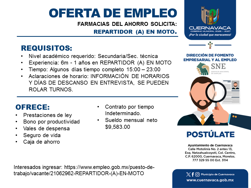 Por favor, para apuntarte a este trabajo visita www.empleo.gob.mx.