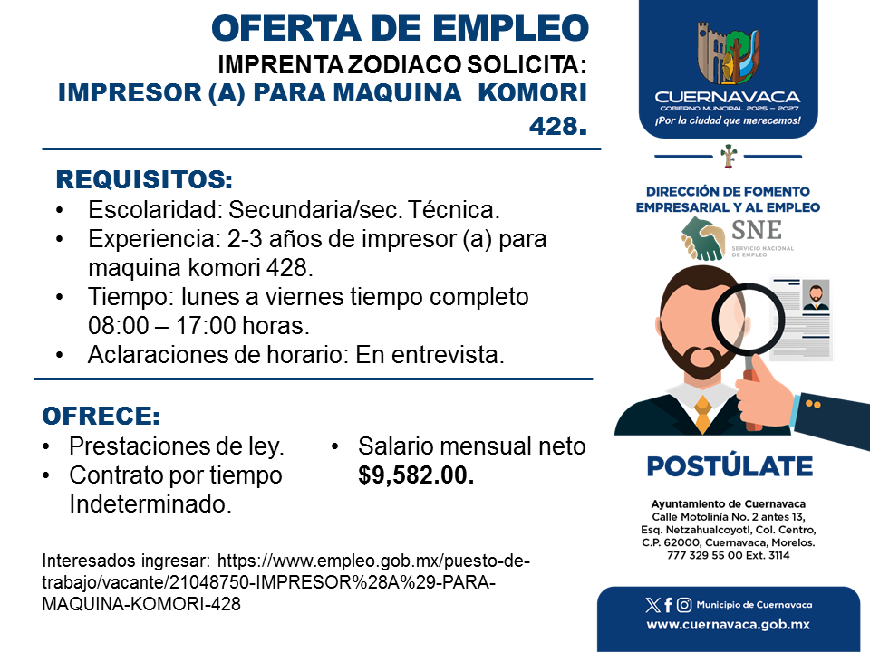 •Experiencia: 2-3 años de impresor (a) para maquina komori 428.