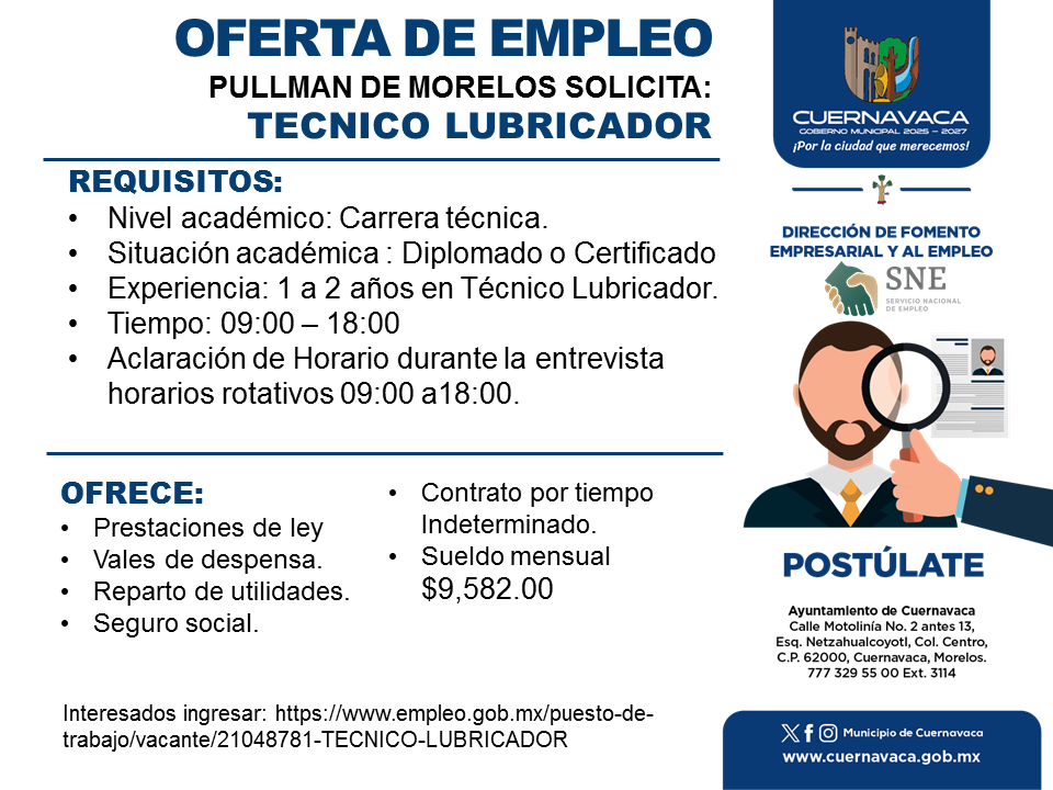 •Experiencia: 1 a 2 años en Técnico Lubricador.