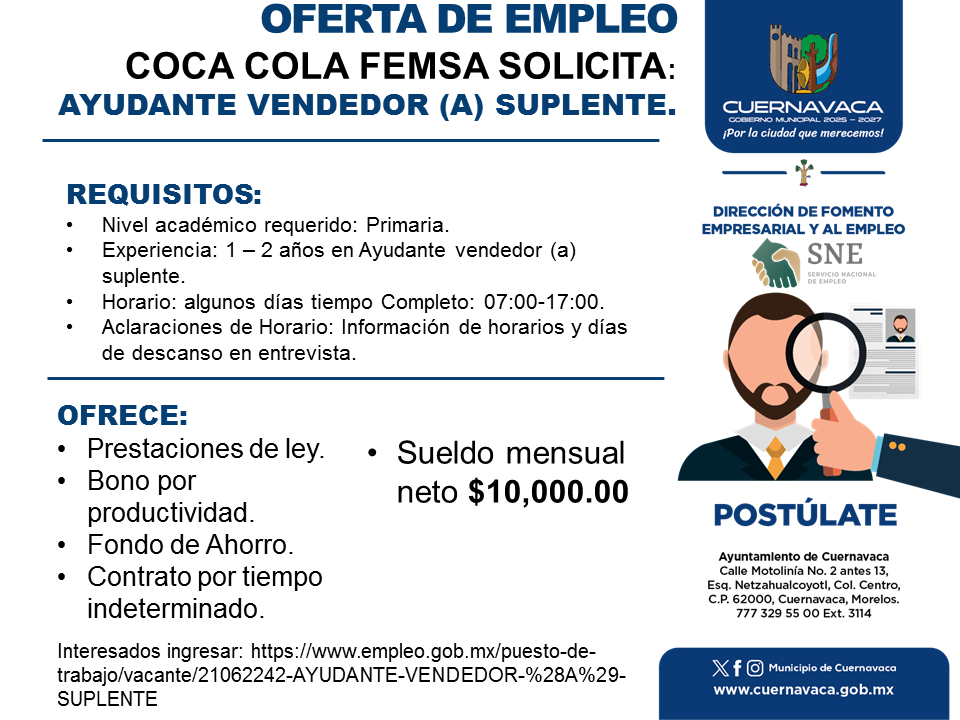 •Experiencia: 1 – 2 años en Ayudante vendedor (a) suplente.