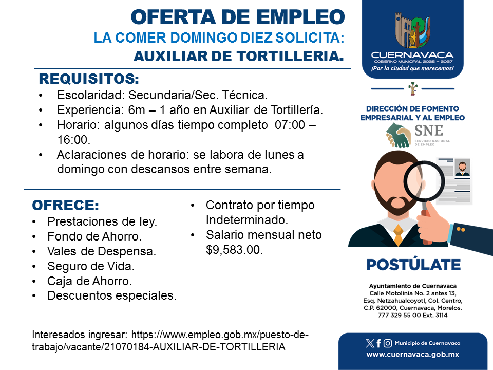 •Experiencia: 6m – 1 año en Auxiliar de Tortillería.