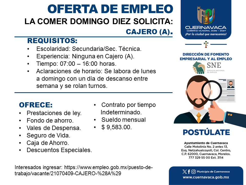 •Experiencia: Ninguna en Cajero (A).