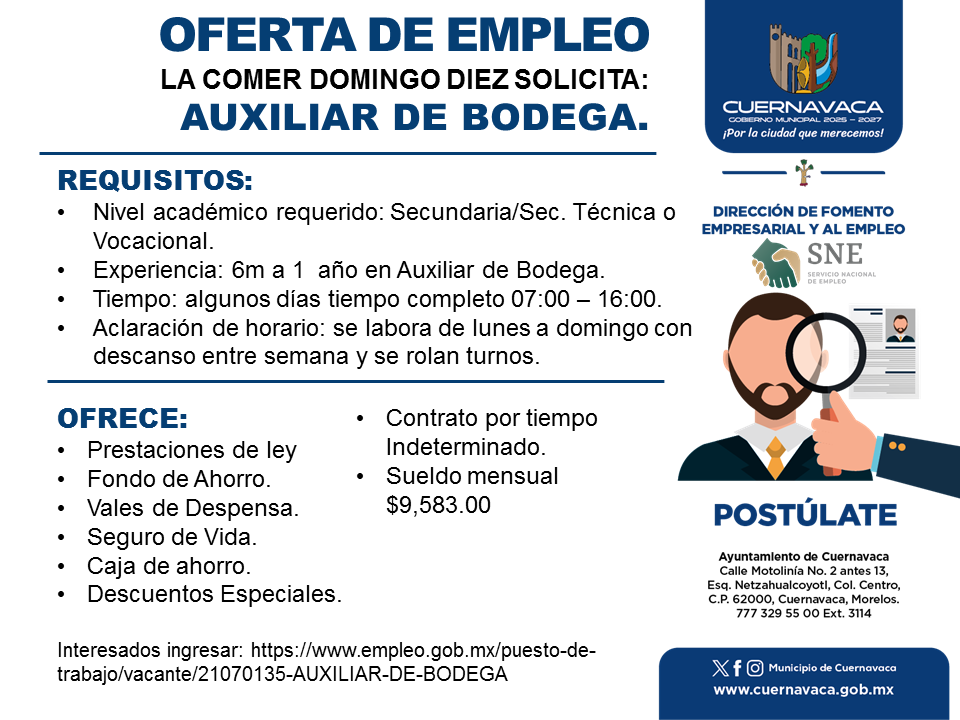•Nivel académico requerido: Secundaria/Sec. Técnica o Vocacional.