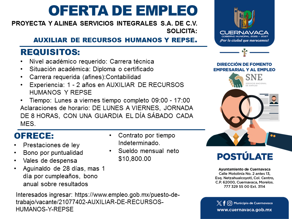 •Experiencia: 1 – 2 años en AUXILIAR DE RECURSOS HUMANOS Y REPSE