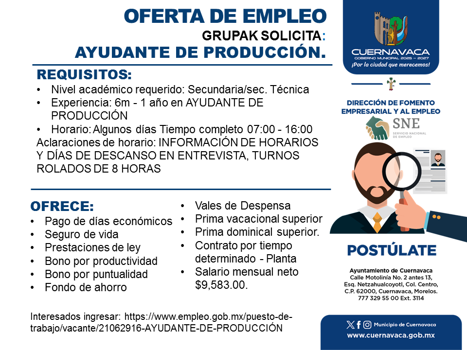 •Horario: Algunos días Tiempo completo 07:00 – 16:00