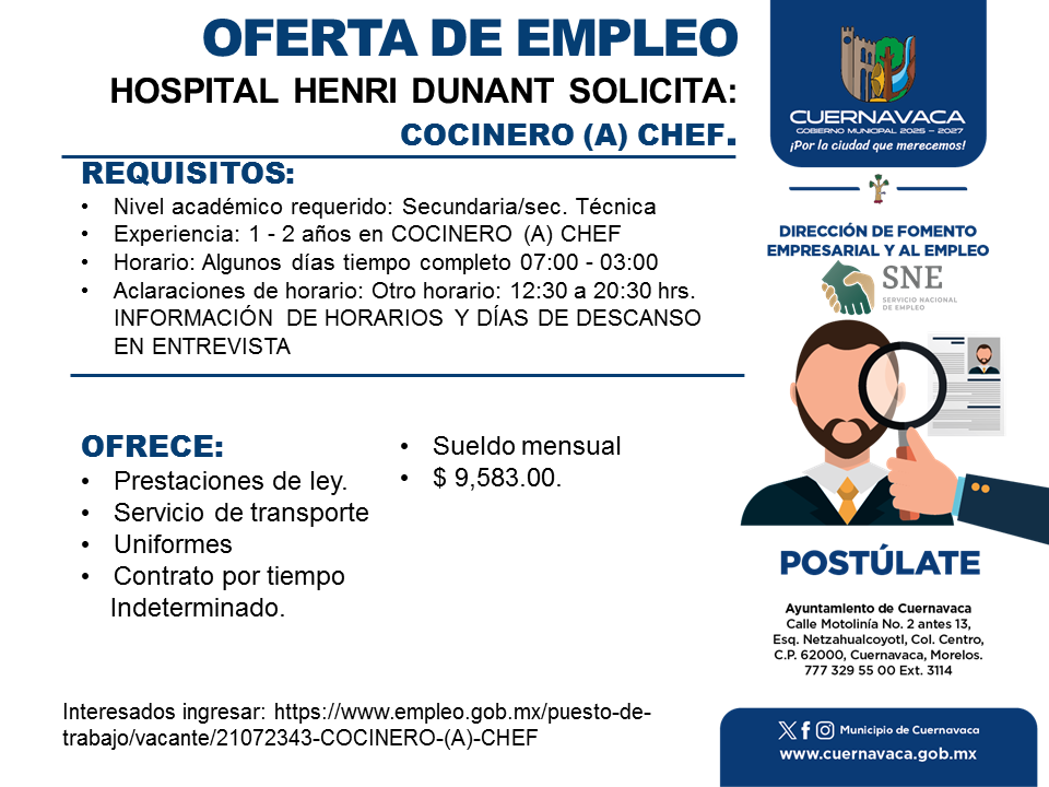 •Horario: Algunos días tiempo completo 07:00 – 03:00