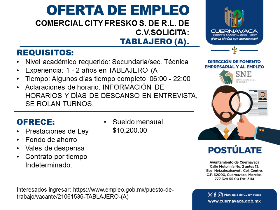 •Experiencia: 1 – 2 años en TABLAJERO (A