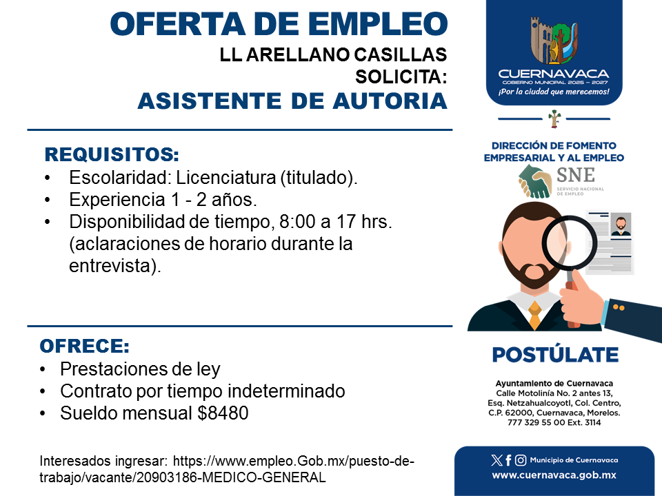 •Disponibilidad de tiempo, 8:00 a 17 hrs. (aclaraciones de horario durante la entrevista).