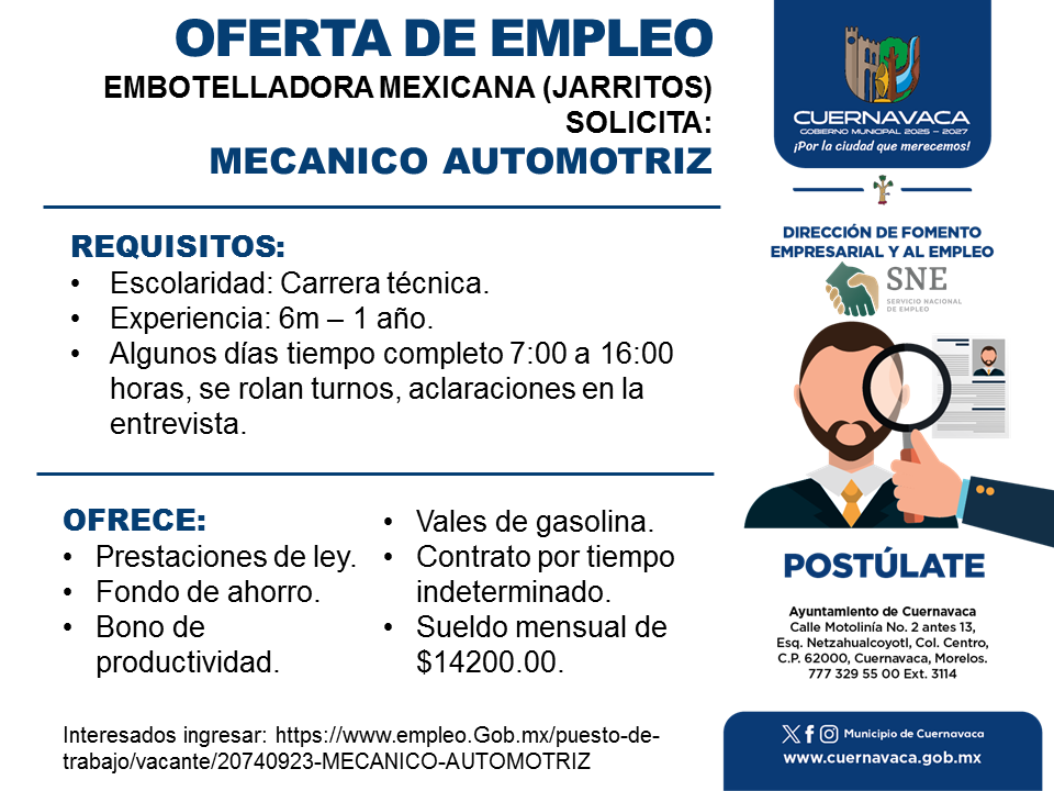 •Algunos días tiempo completo 7:00 a 16:00 horas, se rolan turnos, aclaraciones en la entrevista.