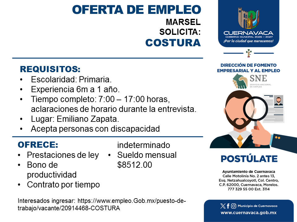 •Tiempo completo: 7:00 – 17:00 horas, aclaraciones de horario durante la entrevista.