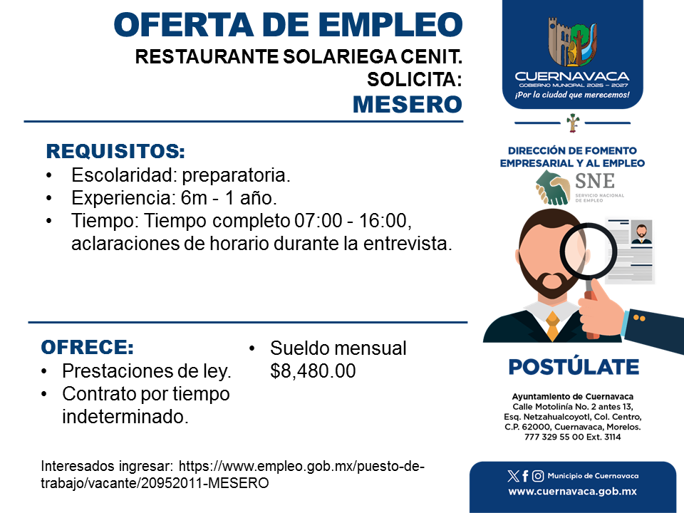 Tiempo: Tiempo completo 07:00 – 16:00, aclaraciones de horario durante la entrevista