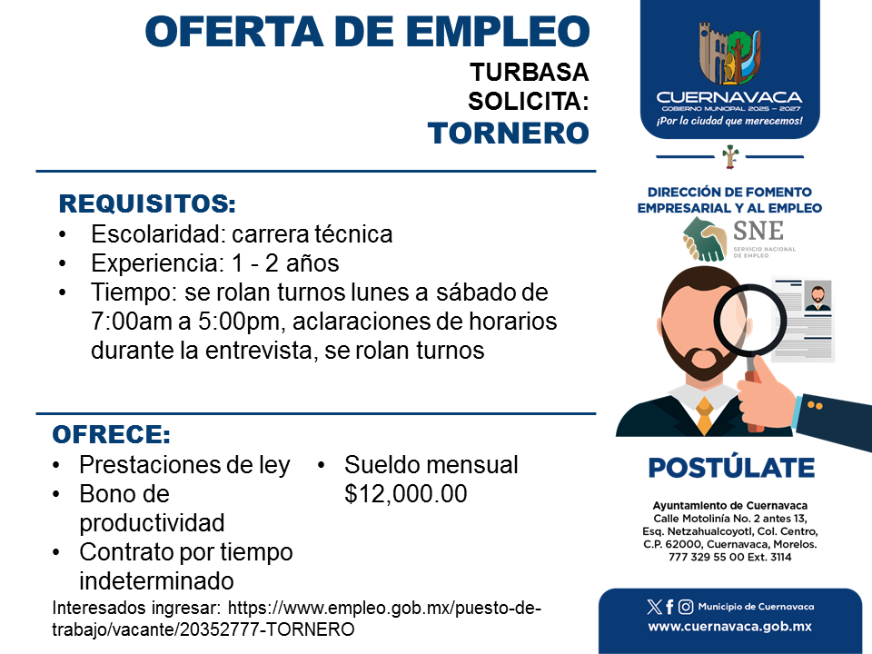 •Tiempo: se rolan turnos lunes a sábado de 7:00am a 5:00pm, aclaraciones de horarios durante la entrevista, se rolan turnos
