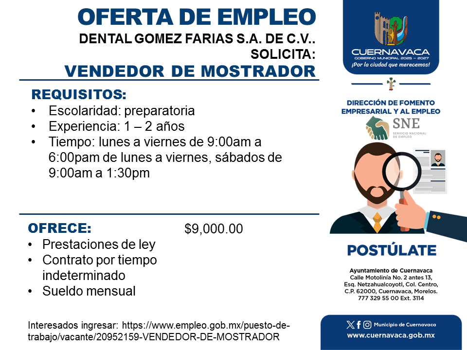 •Tiempo: lunes a viernes de 9:00am a 6:00pam de lunes a viernes, sábados de 9:00am a 1:30pm