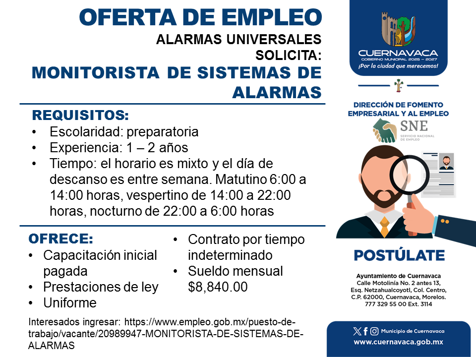 •Tiempo: el horario es mixto y el día de descanso es entre semana. Matutino 6:00 a 14:00 horas, vespertino de 14:00 a 22:00 horas, nocturno de 22:00 a 6:00 horas
