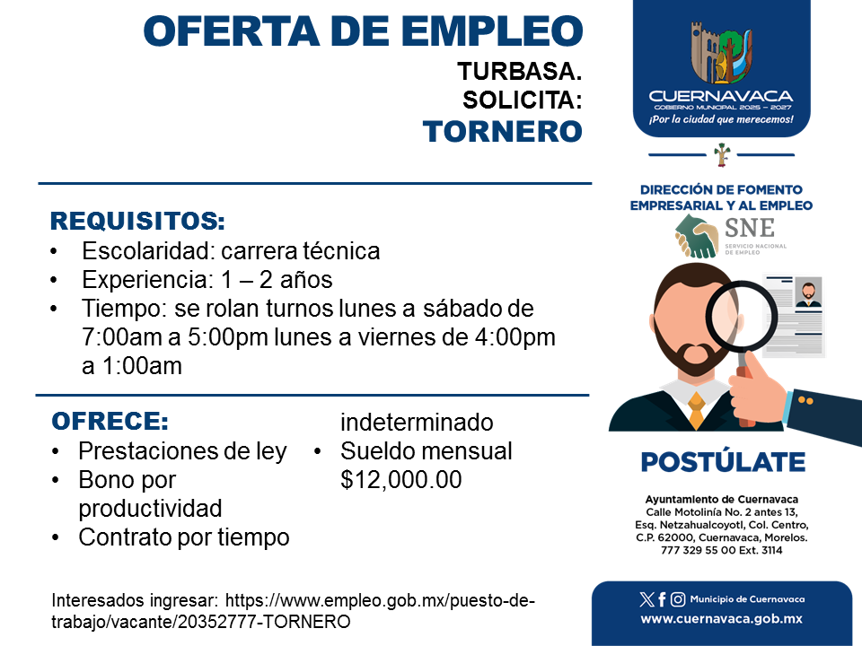 •Tiempo: se rolan turnos lunes a sábado de 7:00am a 5:00pm lunes a viernes de 4:00pm a 1:00am