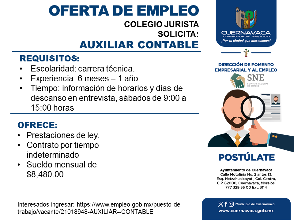•Tiempo: información de horarios y días de descanso en entrevista, sábados de 9:00 a 15:00 horas