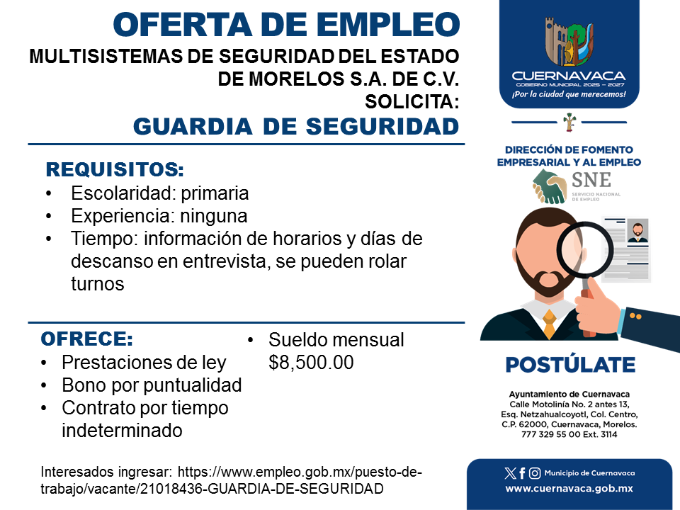 •Tiempo: información de horarios y días de descanso en entrevista, se pueden rolar turnos