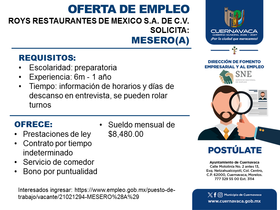 •Tiempo: información de horarios y días de descanso en entrevista, se pueden rolar turnos