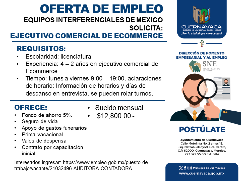 •Tiempo: lunes a viernes 9:00 – 19:00, aclaraciones de horario: Información de horarios y días de descanso en entrevista, se pueden rolar turnos.