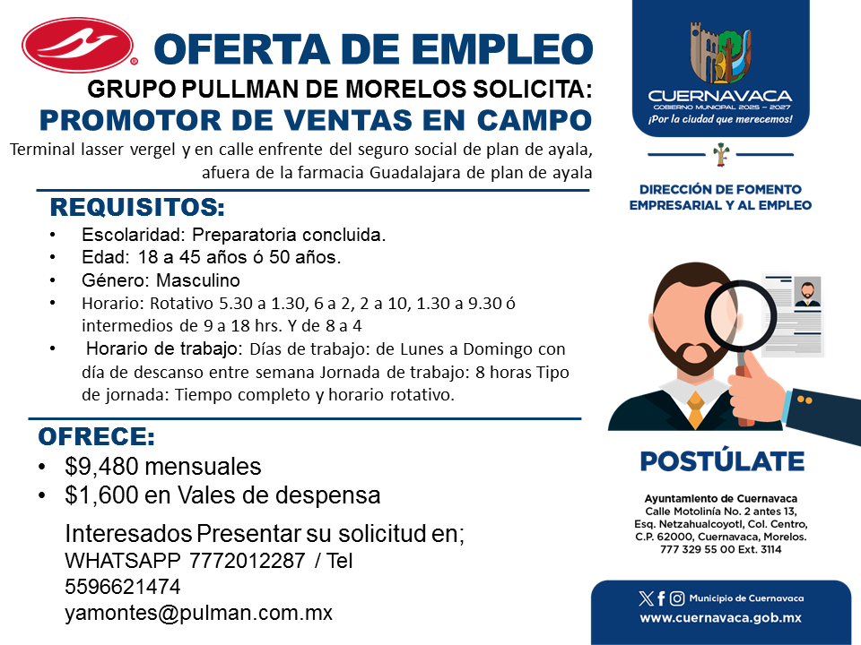 • Horario de trabajo: Días de trabajo: de Lunes a Domingo con día de descanso entre semana Jornada de trabajo: 8 horas Tipo de jornada: Tiempo completo y horario rotativo.