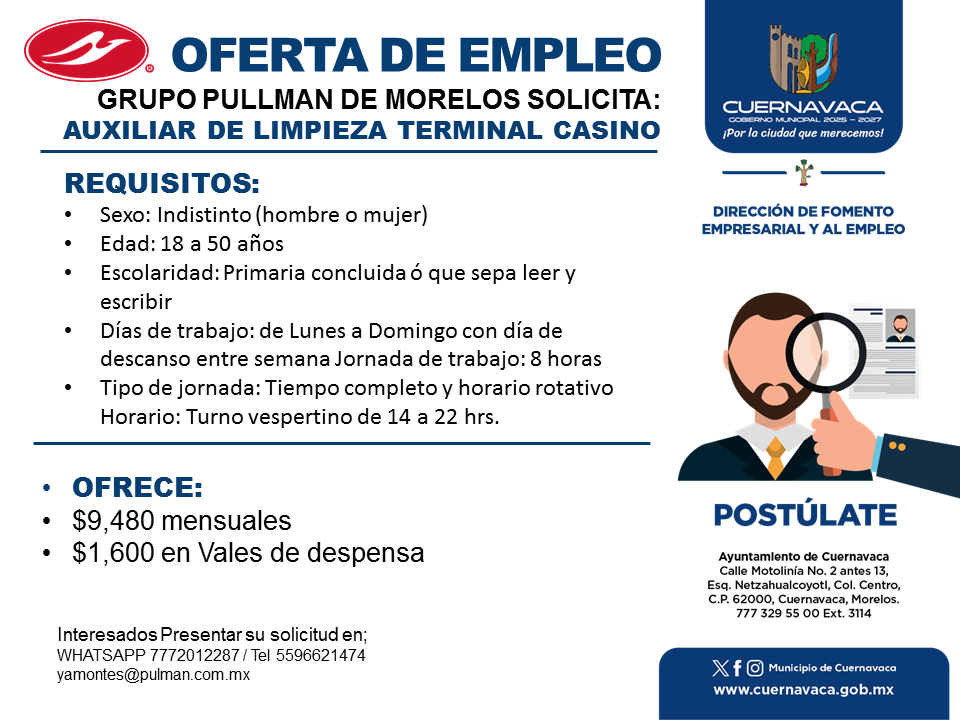 •Tipo de jornada: Tiempo completo y horario rotativo Horario: Turno vespertino de 14 a 22 hrs.