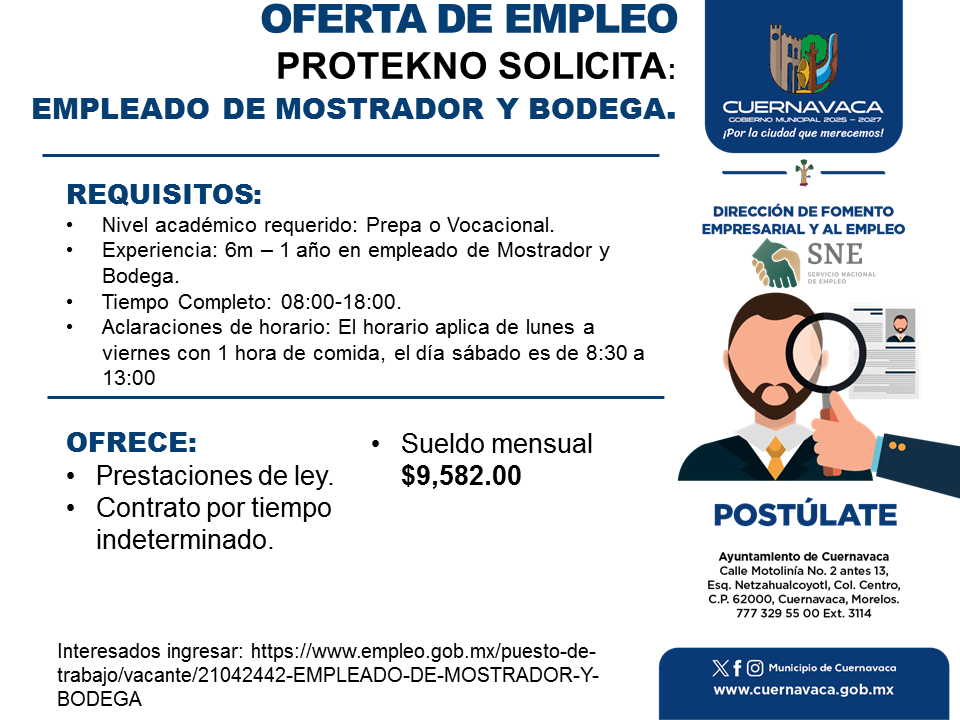 •Aclaraciones de horario: El horario aplica de lunes a viernes con 1 hora de comida, el día sábado es de 8:30 a 13:00