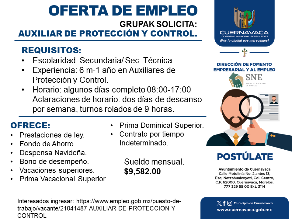 •Horario: algunos días completo 08:00-17:00 Aclaraciones de horario: dos días de descanso por semana, turnos rolados de 9 horas.